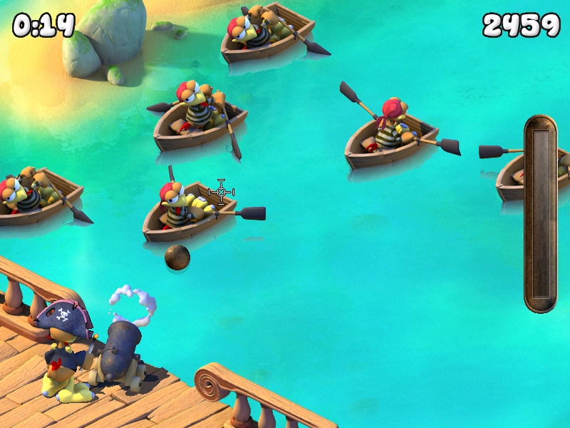 Du gelangst in den Bonuslevel, wenn du in den 90 Sekunden zuvor mindestens 1500 Punkte gesammelt hast. Deine Aufgabe ist es hier, 60 Sekunden lang den Kapitän zu vertreten und die Piratenhühner in ihren Ruderbooten so lange wie möglich von deinem Schiff fern zu halten. Damit dir das gelingt, steht dir eine Kanone zur Verfügung, die du ganz einfach durch Bewegung des Cursors drehen kannst, um die Richtung deines Schusses zu bestimmen. Um die Weite deines Schusses zu beeinflussen, musst du die linke Maustaste gedrückt halten. Die Anzeige am rechten Bildschirmrand zeigt dir dabei, wie stark dein Schuss letztendlichausfällt. Triffst du ein