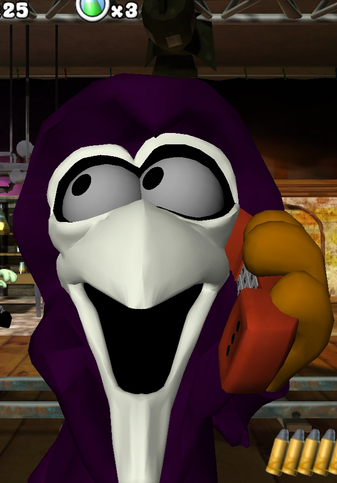 | Gegner | Toilettenhuhn • Anglerhuhn • Bienenhuhn • Autohuhn • Ofenhuhn • Sonnenblumenhuhn • Pfannenhuhn • Drachenhuhn • Schornsteinhuhn • Hundehüttenhuhn • Toter Harfenspieler • Tonnenhuhn • Huhn im Kornfeld • Trampolinhuhn |