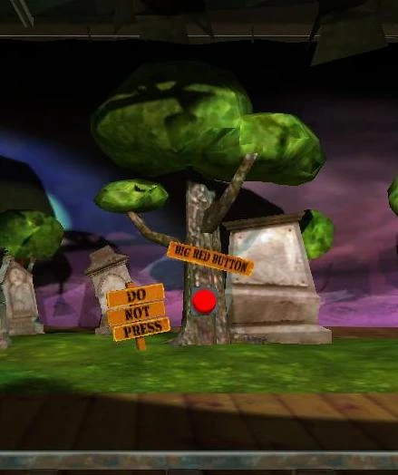 Wenn man ihn betätigt, taucht ein Skellet direkt vor dem Spieler auf, welches beim Abschuss 25 Punkte beschert. Man kann den Knopf insgesamt zweimal betätigen und damit 2x 25 Punkte einkassieren. Andernfalls verschwindet es wieder. Man findet den Knopf in der 4. Szene, in der Mitte an einem Baum. Auf dem Schild darüber steht "BIG RED BUTTON" und auf dem Schild daneben "DO NOT PRESS".